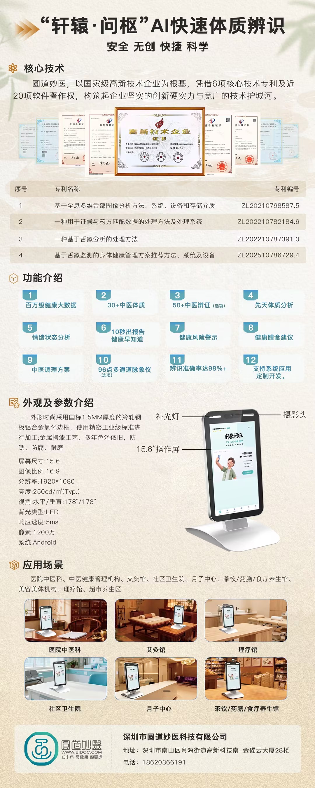 它被誉为门店的“健康筛查智能前台”,以安全、无创、快捷、科学为核心,融合多项发明专利,旨在将复杂的中医体质辨识,转化为一项10秒内可完成的沉浸式体验,极大提升服务效率与专业形象。